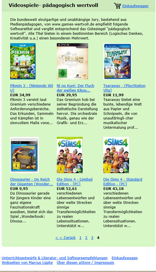 Die Weihnachtszeit naht und in der heutigen Zeit stehen digitale Spiele ganz oben auf dem Wunschzettel der Heranwachsenden. Die Jury der „Games-Wertvoll“-Initiative hat sich die Mühe gemacht und viele „Games“ auf ihre Sinnhaftigkeit und den pädagogischen (erzieherischen) Mehrwert zu prüfen. Hier ist die Auswahl der Spiele, die das Gütesiegel „pädagogisch wertvoll“ erhalten haben. Pädagogisch wertvolle Videospiele/ Computerspiele weiterlesen
