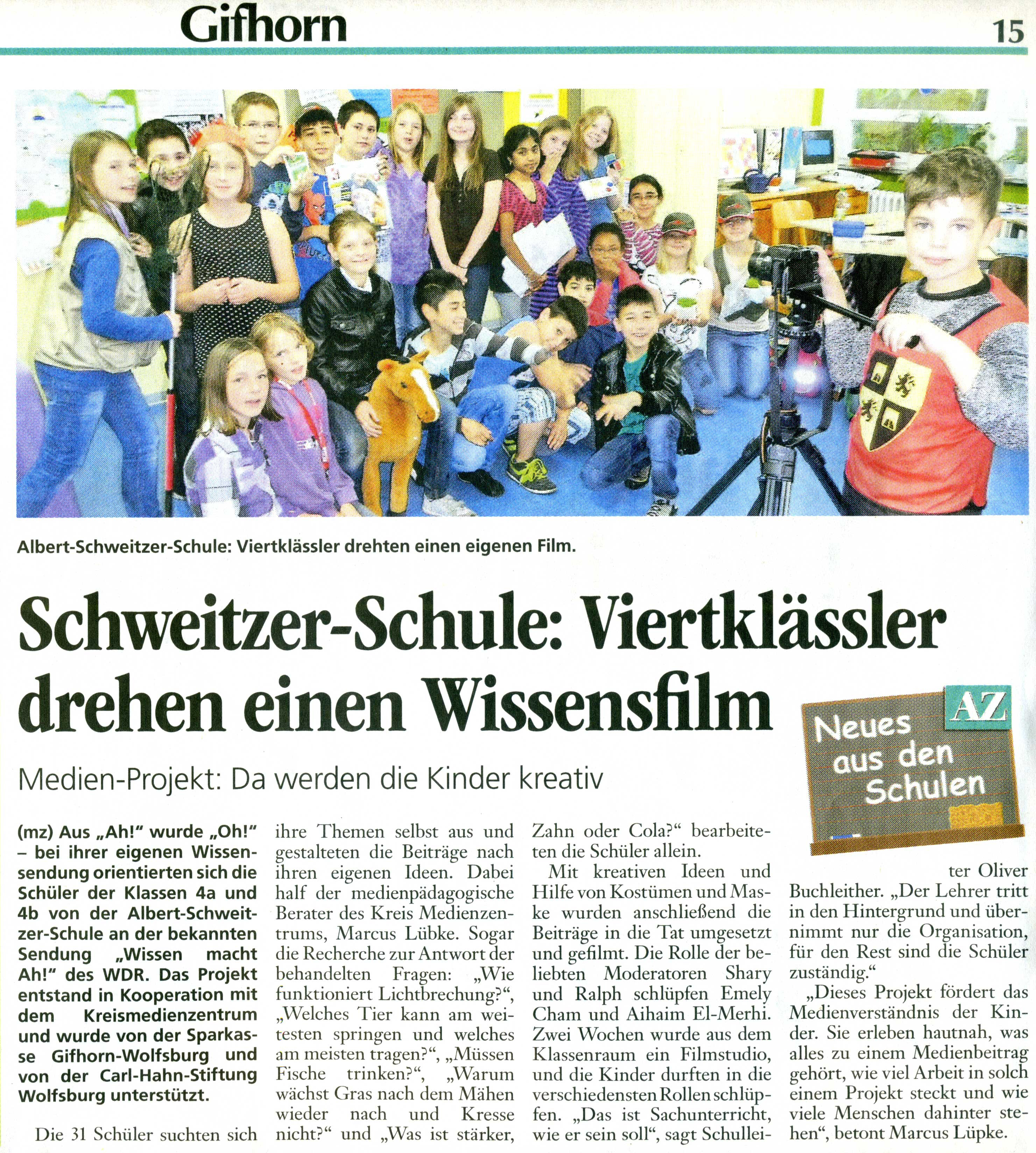Unter der Leitung von Marcus Lüpke kamen die Schülerinnen und Schüler der 4. Jahrgänge an der Albert-Schweitzer-Schule in Gifhorn zu einem beeindruckenden Abschluss. Die Schüler hatten aus dem Unterricht heraus die Idee, eine eigene Wissenssendung zu erstellen. Als Vorlage diente die beliebte Sendung „Wissen macht Ah!“, die vom WDR produziert wird. Das Projekt wurde durch die medienpädagogische Beratung des Landkreises Gifhorn und die Carl Hahn Stiftung sowie der Sparkasse Gifhorn Wolfsburg unterstützt.